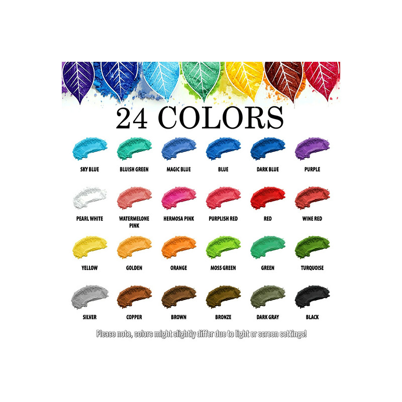 • 24 VIBRANT COLORS + STICK : Our shimmering/metallic mica powder pigment set includes: Purple, Sky Blue, Dark Blue, Red, Purplish Red, Orange, Pearl White, Magic Blue, Copper, Brown, Wine Red, Bronze, Silver, Dark Gray, Black, Yellow, Green, Blue, Bluish Green, Moss Green, Golden, Turquoise, Watermelon Pink, Hermosa Pink colors. Let your creative desire no longer be limited with this selection.